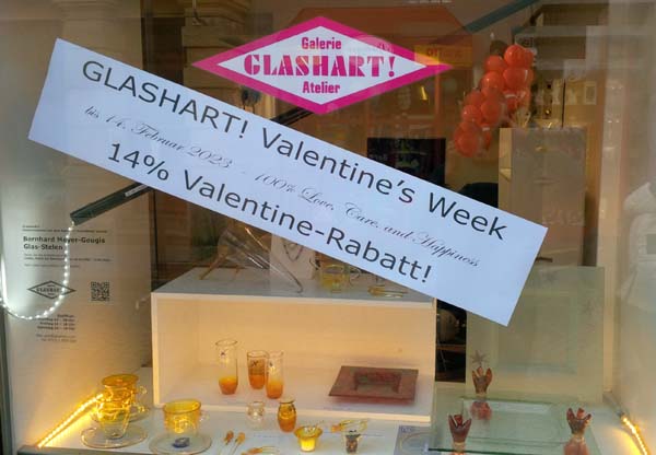 Vielleicht ein persönliches Geschenk in Form einer „Bouteille Mystère“ mit einer persönlichen Botschaft, einen Glas-Parfümflakon mit Gravur oder ein außergewöhnliches Schmuck-Unikat wie zum Beispiel die neu gestaltete Schmucklinie mit „Rollerprinting“? Oder schreiben Sie einen Brief mit dem neu gestalteten Glaskugelschreiber. Sie können diesen auch gleich mit verschenken. Dann nehmen Sie eben zwei. Alles aus der Goldschmiede-Werkstatt von Angelika Geugis sowie aus dem Glasatelier von Bernhard Meyer-Geugis. GLASHART! Valentine’s Week vom 9. bis 14. Februar 2023 - 100% Love, Care and Happiness - 14% Valentine-Rabatt! [Galeriebesuch ...] [Gmünder Tagespost ...] [Rems-Zeitung ...] [Xaver ...]